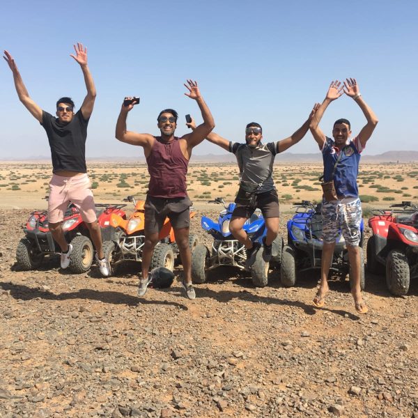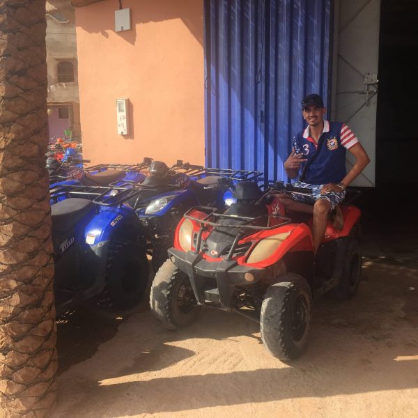 Safety first: Equipment briefing (Yamaha quad) and… program: trails through stony reg desert, Berber villages, cross the wadi to explore the vast but diminishing remnants of the Marrakech palmeraie. And of course, great views of the High Atlas, the roof of North Africa. Our detailed knowledge of the area, top-notch in-house maintenance and the complete reliability of our equipment means this family-friendly half day excursion can also be tailored, on demand, to suit you and your parties tastes for exploration and adventure, all within the comfort of Marrakech.